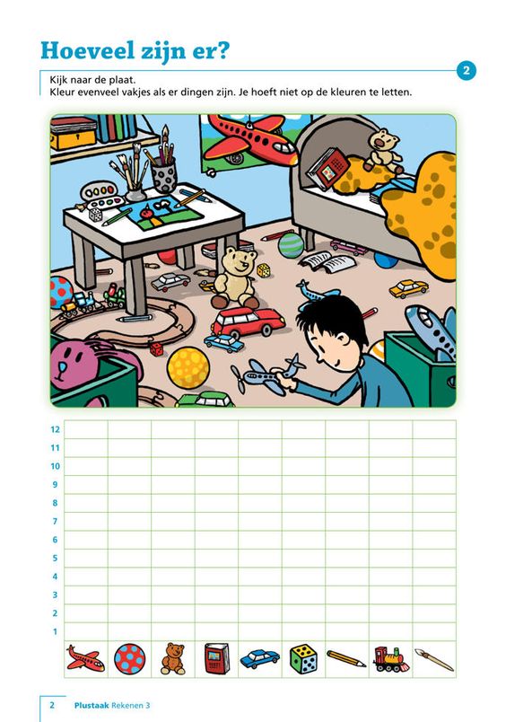 Kijk naar de prent. Kleur evenveel vakjes als er dingen zijn. Je hoeft niet op de kleuren te letten. Probeer niet te snel te zijn. Werk steeds kolom per kolom.